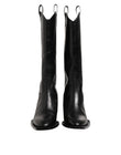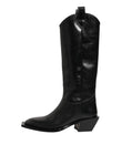 boots feature a sleek black finish. Designed with an over-the-calf silhouette, they offer a striking style statement while providing a comfortable fit. Perfect for pairing with skirts, dresses, or slim trousers for an effortlessly chic ensemble.