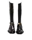 boots feature a sleek black finish with a signature logo plaque accent. Designed with an over-the-calf silhouette, they offer a striking statement style while providing a comfortable fit. Perfect for pairing with skirts, dresses, or slim trousers for an effortlessly chic ensemble.