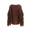 Fabiana Filippi’s Cardigan is a piece with a refined style, featuring a front button closure and ribbed trim at the hem. The sleeves are embellished with maxi ruffled bangs, giving movement and a contemporary touch to the ensemble.