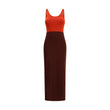 Fendi’s long knit Dress features a fitted silhouette and sleeveless design with thin straps and a wide round neckline. Made of viscose yarn with a color-block pattern, it combines elegance and modernity in a sleek, feminine silhouette.