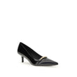 Pinko’s Gloria Pumps in patent leather are a perfect balance of classic elegance and modern details. The pointed toe design slims the silhouette and gives a refined allure, while the glossy patent leather finish enhances the shoe with a sophisticated touch. At the front, a decorative chain embellished with the brand’s logo stands out, adding personality and style. The low, slim kitten heel ensures comfort without sacrificing femininity, making these pumps ideal for both daytime looks and more formal occasions