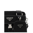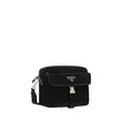 Nylon Shoulder Bag by Prada, adjustable and removable shoulder strap with embroidered brand signature, removable mini pouch with zipper, triangular brand monogram plaque applied embossed on pouch, front push lock closure, iconic brand triangle applied embossed on flap, double interior compartment, top zipper closure.