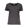 short sleeve t-shirt, wide neckline, contrasting details, embroidery, logo