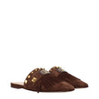 The product with MPN S0LP4ZFWKG8 and code F84240 suede in brown is a slippers and clogs designed by Valentino Garavani. It has features like front logo, studs, fringes.