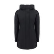 Boulder Down Jacket by Woolrich, front zipper closure with concealed snap buttons, faux fur-lined hood design, elastic ribbed cuffs, padded and quilted inner lining design, buttoned welt pockets, brand’s iconic logo patch applied on left shoulder.